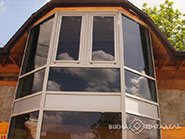 Скляна поверхня поділена вертикальними та горизонтальними лініями декоритивних накладок; склопакети встановлюються зовні та фіксуються притискною планкою.