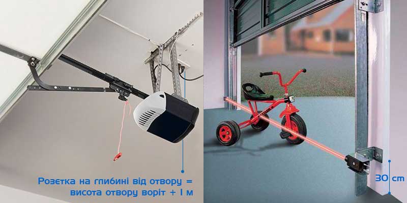 Для підключення автоматики гаражніх воріт слід розмістити на стелі розетку по центру воріт на відстані = висота отвору гаражніх воріт + 1 м. Слід використати трьохжильний кабель з мінімальною площею перерізу кабеля - 1 кв.мм