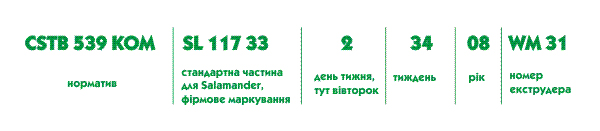 Інший тип маркування - нанесений спеціальним струменевим принтером для друку на погонажних виробах (схема і розшифровка)